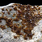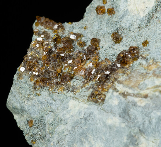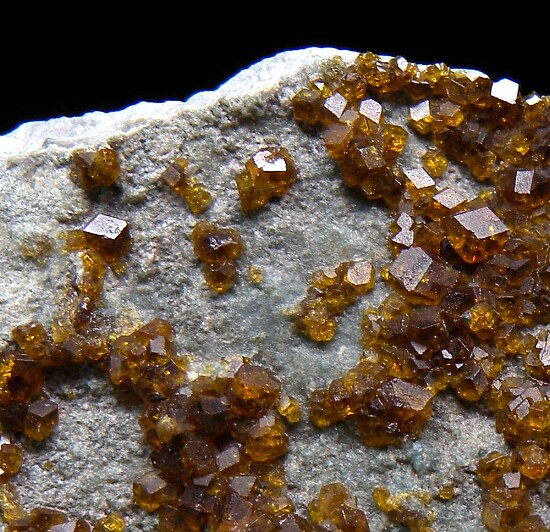 Brilliant, sparkling crystals of Topazolite scattered across the front surface of specimen. These were found long ago at a locality not too far from the Benitoite Gem Mine. Recently released from a private collection and comes with a couple old labels.