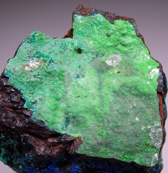 Blue/green Chrysocolla, deep blue Azurite all intermixed in a black base making a highly colorful specimen. One side is coated by a bright green, bubbly-looking mineral, possibly Variscite. This came unlabelled in a recent collection purchase.