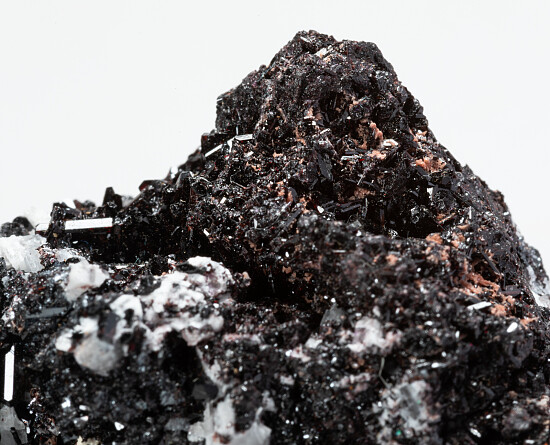 Dark red lustrous prismatic Vesuvianite on a Manganite and Calcite rich matrix. Bright red flashes are apparent under strong lighting. A Kalahari classic.