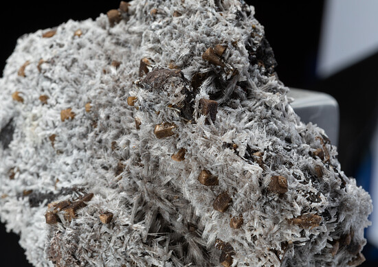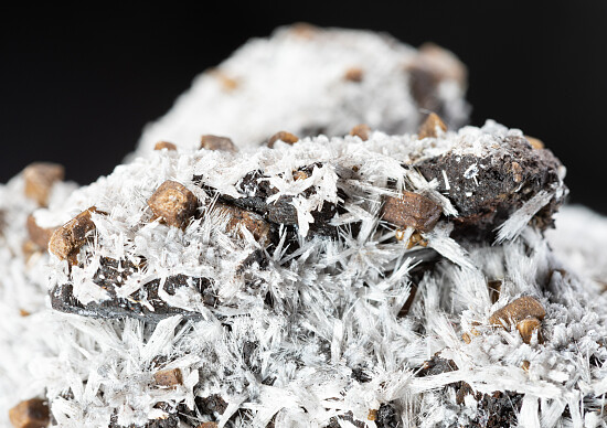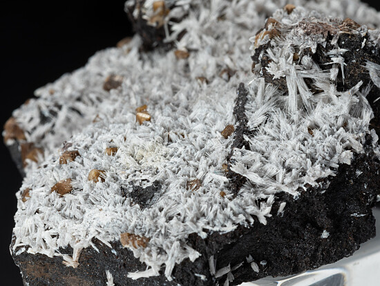 White sprays of needle-like Bulfonteinite and tan crystals of Poldervaartite on a manganese rich matrix. This is a classic old combination found for a short time and now no longer often seen. Recently released from a private collection and valued at $200.