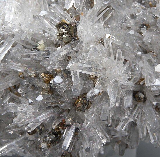 Very bright and sparkly large specimen of needle-like Quartz crystals with Pyrite and Chalcopyrite crystals. The Quartz are transparent and in excellent condition, so much brighter and showy in person. A classic large display piece from Romania. Recently released from a private collection and comes with an old Spectrum Minerals label showing a price of $75 (from years ago).