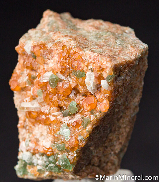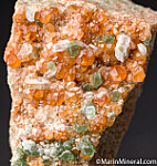 Quality crystals of orange Grossular, green Chlorite, and transparent white Diopside crystals. Out of an old collection built in the 1970s-80s. All very nice but I particulalry like the glassy transparent Diopside crystals on this specimen.