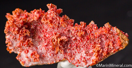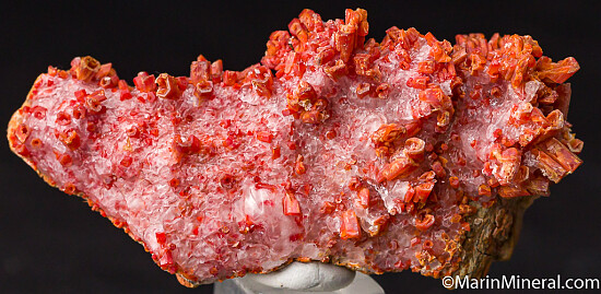 Elongated, hoppered Vanadinite crystals in white Calcite. Good crystals on both sides. Specimens from the Gray Horse Mine are relatively uncommon and Arizona classics. Out of an old collection built in the 1970s-80s. Valued at $150.