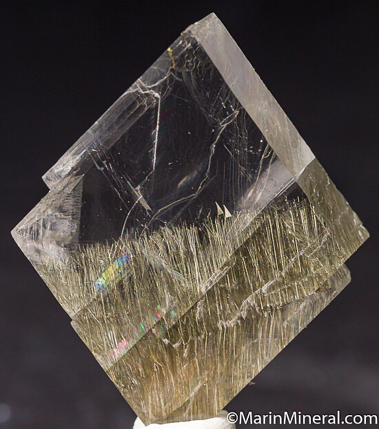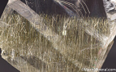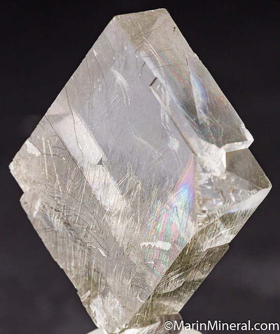 Needles of acicular Pyrite crystals in a transparent cleavage rhomb of Calcite. From an old Pyrite collection built in the 1970s-80s.