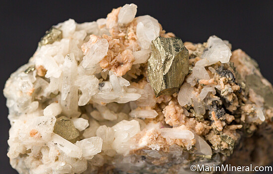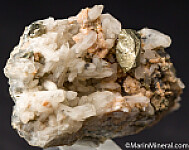 A 1cm Pyrite crystal set on Quartz crystals and minor amounts of Rhodochrosite.