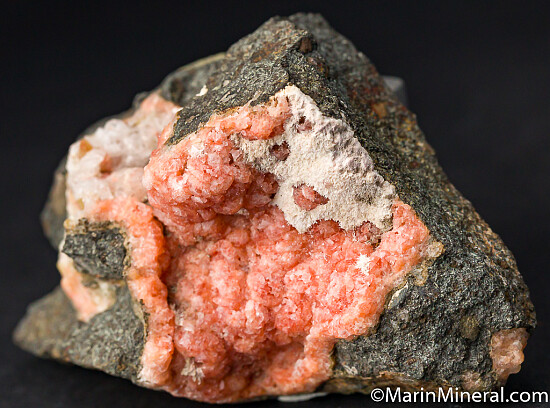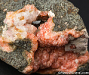 Peach colored Gmelinite lining vugs on matrix. Gmelinite is a fairly uncommon zeolite mineral (a hydrated sodium calcium aluminum silicate) and occurs on the specimen with Analcime, Natrolite and potentially other zeolites. Old specimen from a 1980s era collection. Sawcut on base.