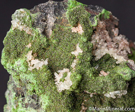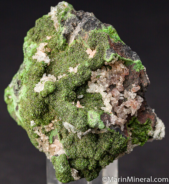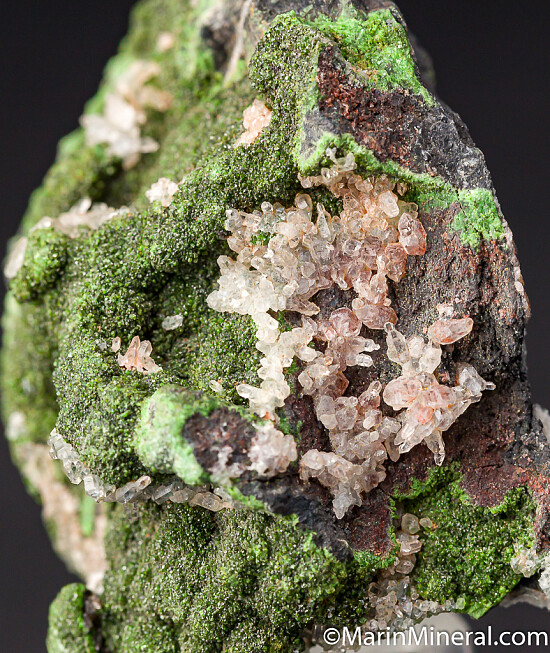 Quartz crystasl atop deep forest green Conichalcite. Old specimen from a 1980s era collection with good coverage of crystals all over the many sides of the specimen.