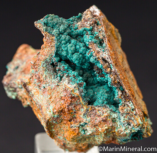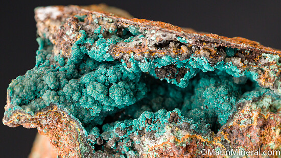 Rosasite on Limonite with main coverage in a 3cm wide vug, completely lined with Rosasite. Comes with an old Burminco label. Out of an old collection built in the 1970s-80s.