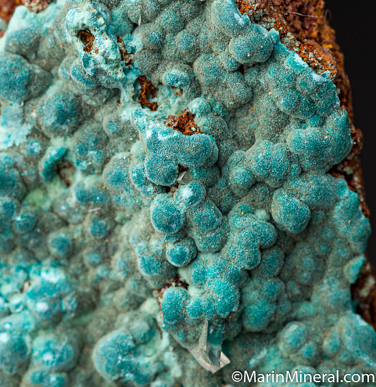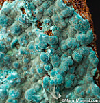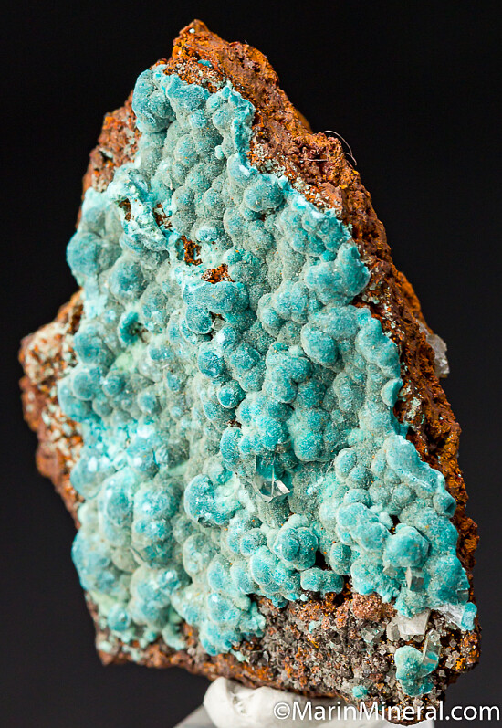 Blue Aurichalcite on Limonite with a few small Calcite crystals. Comes with an old Burminco label. Out of an old collection built in the 1970s-80s.
