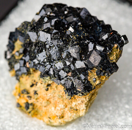 Lustrous black Andradite crystals on matrix. These are found near the Benitoite Gem Mine. An excellent example out of an old collection and comes mounted in a plastic display case.