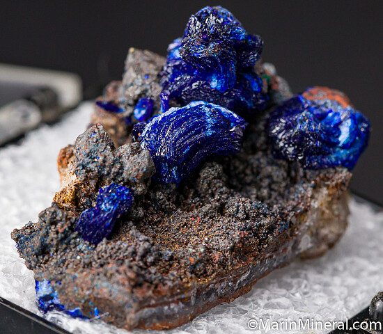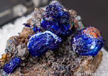 Rosette formations of bright 'electric' blue Azurite crystals on matrix. Stunning and uncommon Arizona thumbnail. There are a couple small spheres of Malachite also present.
