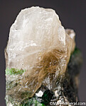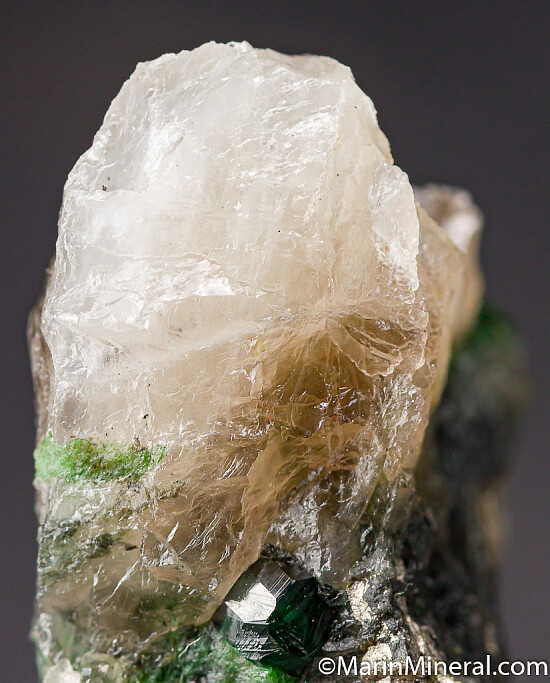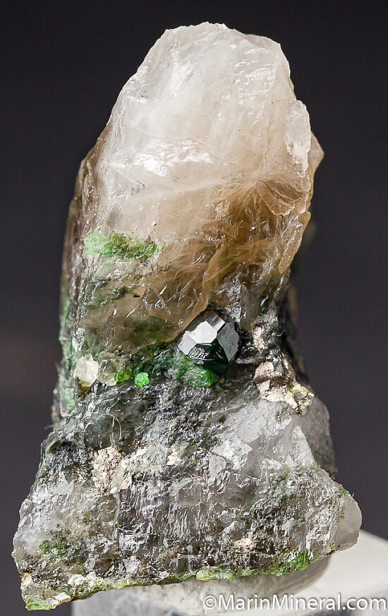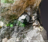 Deep green 1cm Uvarovite crystal in Quartz. The Uvarovite is perfect and undamaged, 4mm wide, and occurs in translucent Quartz with Pyrite and other partial Uvarovite crystals. Rare stuff!