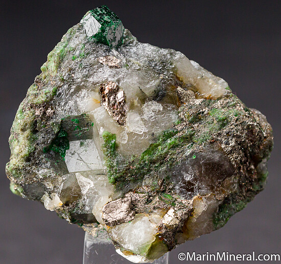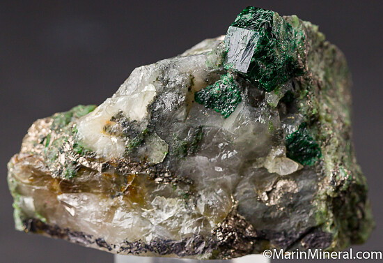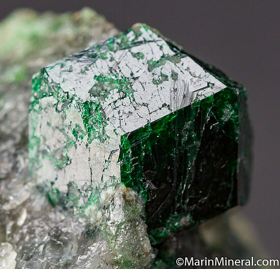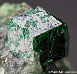 Deep green Uvarovite crystal 1.2cm wide atop Quartz. The crystal is nearly complete, with contacting just on the back face. There are small amounts of Pyrite in the Quartz matrix and it's sawcut on the bottom. Valued at $300.