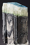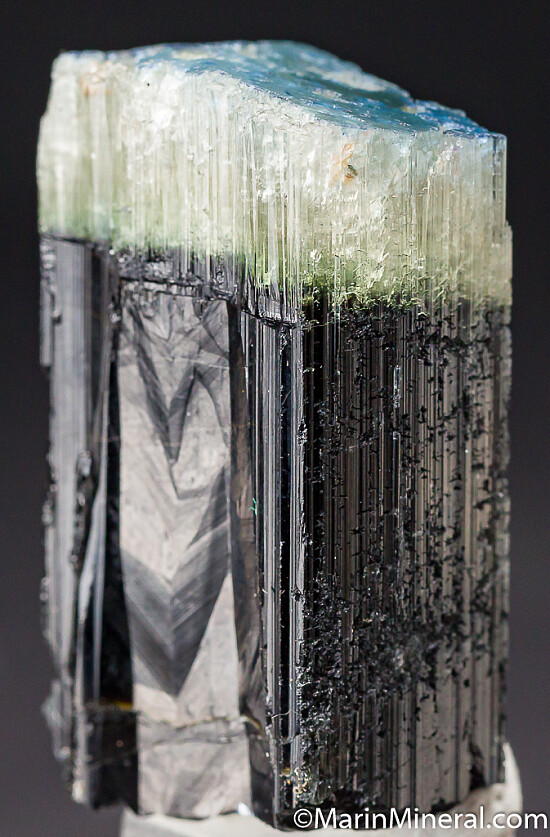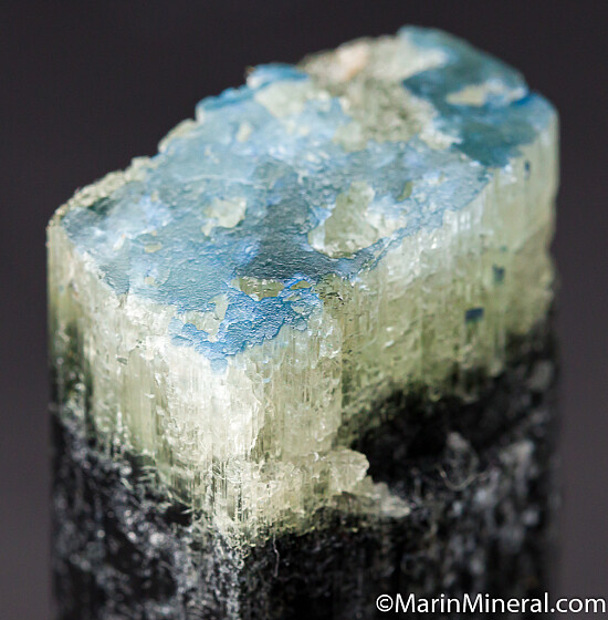 Blue capped Dravite crystal from an unusual, one time find in 2017. The crystal consists of a dark base followed by a translucent to transparent white zone, then a deep blue cap. The termination (blue and white zones) is partially etched but undamaged, though there is minor chipping along the dark prism faces. Rare coloration for Dravite. Good quality single crystal that weighs 34.7 grams, valued at $250.