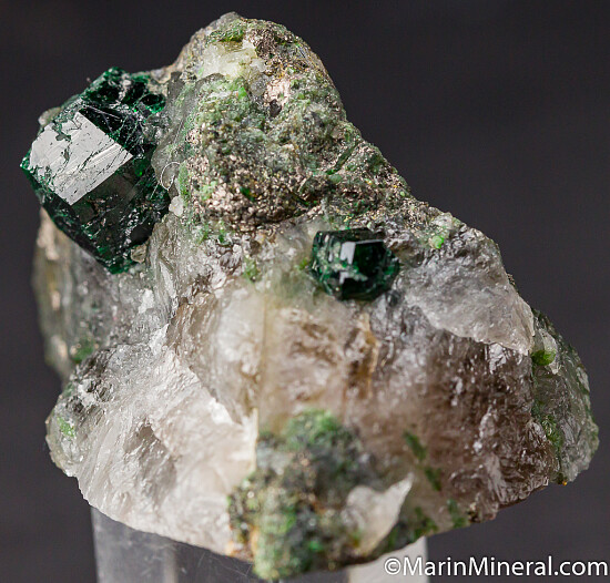 Two intergrown deep green Uvarovite crystals 1.5cm wide in Quartz. The crystals are nearly complete, with some contacting along the top rear surfaces. An undamaged 5mm crystal is sticking out on the right side. There are small amounts of Pyrite in the Quartz matrix and sawcut on the bottom.