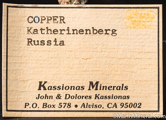 Tall specimen of crystallized Copper with good crystals protruding from both sides. Not only a beautiful specimen but from an uncommonly seen locality. From an old collection and comes with an Kassionas Minerals label.