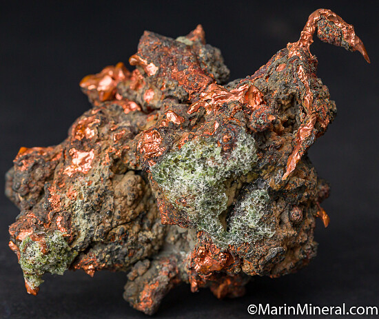 Heavy nugget-like specimen of Copper from Bisbee. Appears to be nearly solid Copper with areas that have retained their bright Copper coloration.