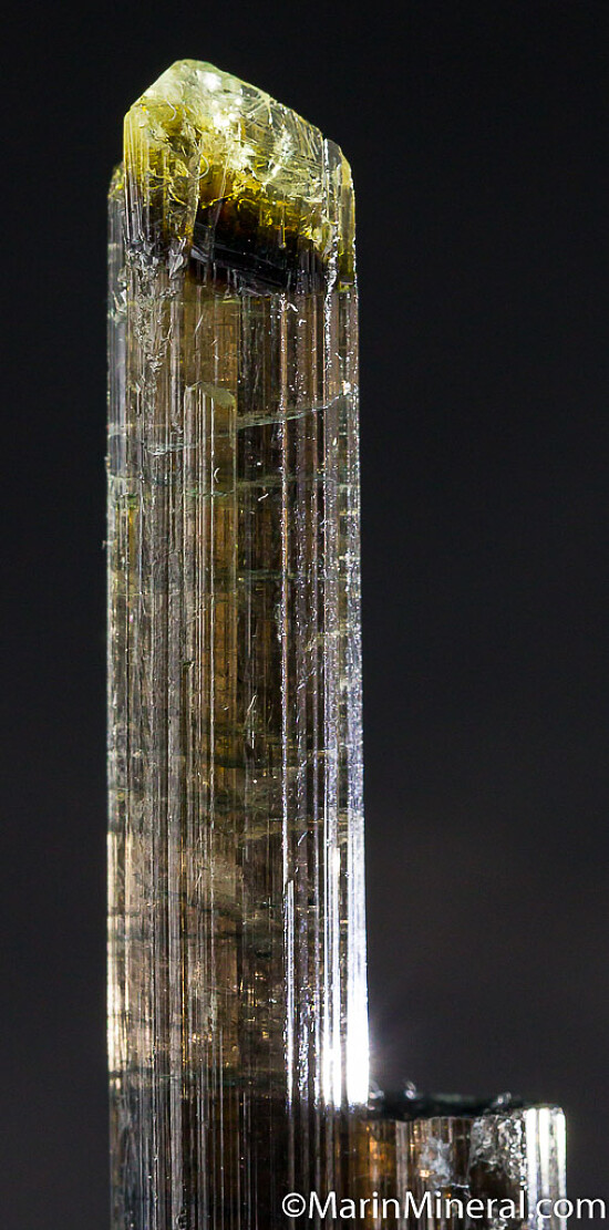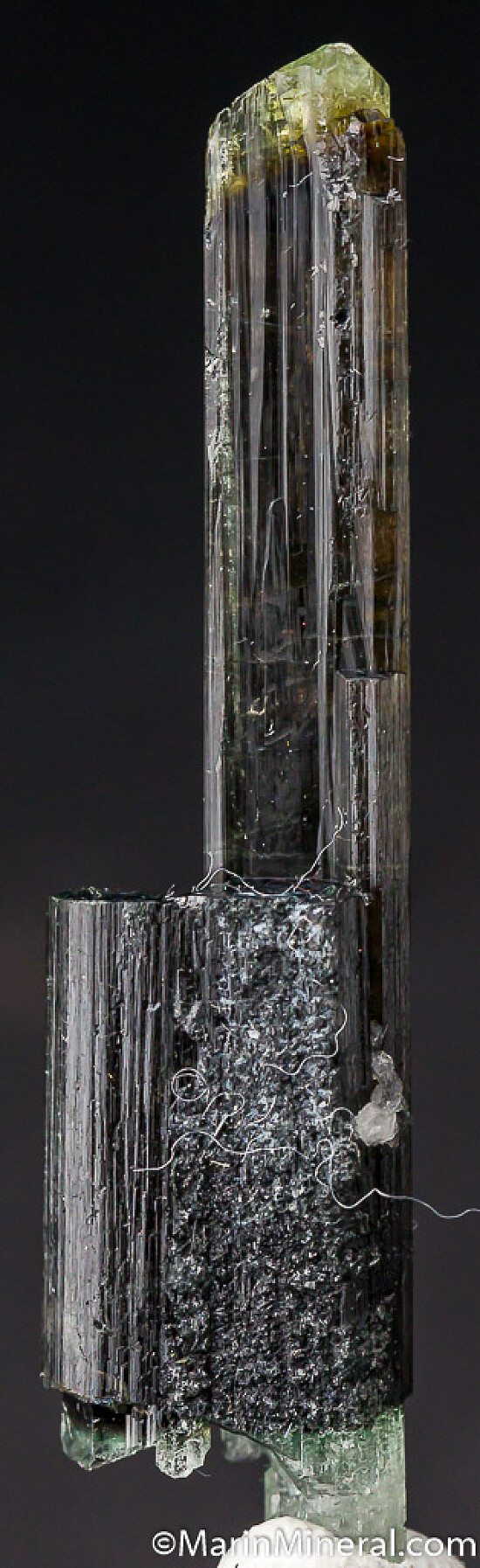 Blue capped Dravite crystal from an unusual, one time find in 2017. Uncommon double-terminated crystal that is also uncommon in that the dark zone is highly translucent (they are usually opaque). One termination end is a translucent to transparent white zone followed by a deep blue cap, the other is a green color. Rare coloration for Dravite.