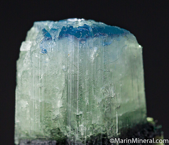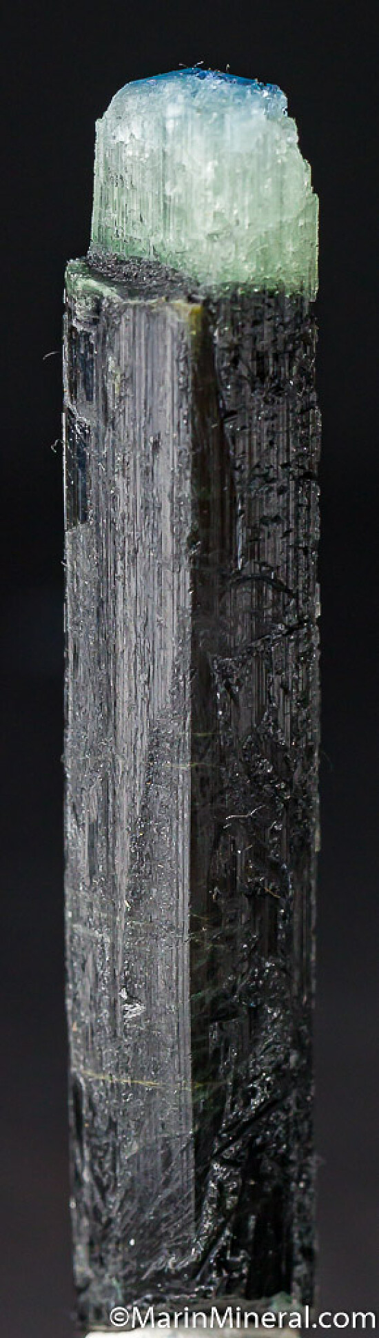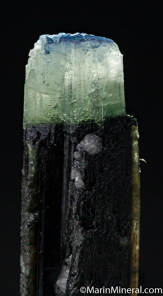 Blue capped Dravite crystal from an unusual, one time find in 2017. There is slightly translucent to opaque dark base followed by a translucent to transparent white zone, then a deep blue cap. The termination (blue and white zones) is partially etched. Rare coloration for Dravite. Good sized.