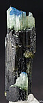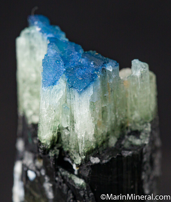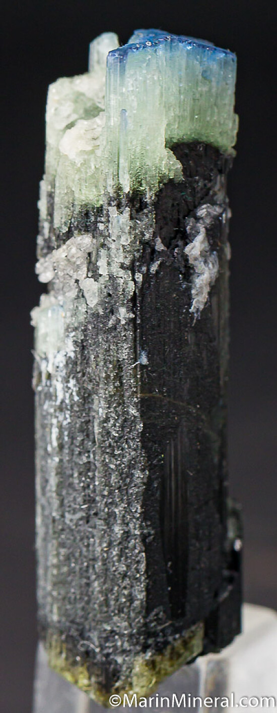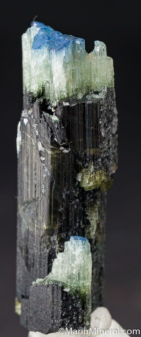 Blue capped Dravite crystal from an unusual, one time find in 2017. There is slightly translucent to opaque dark base followed by a translucent to transparent white zone, then a deep blue cap. The termination (blue and white zones) is partially etched but undamaged. It's also partially double-terminated with green coloration on the other end. Rare coloration for Dravite.