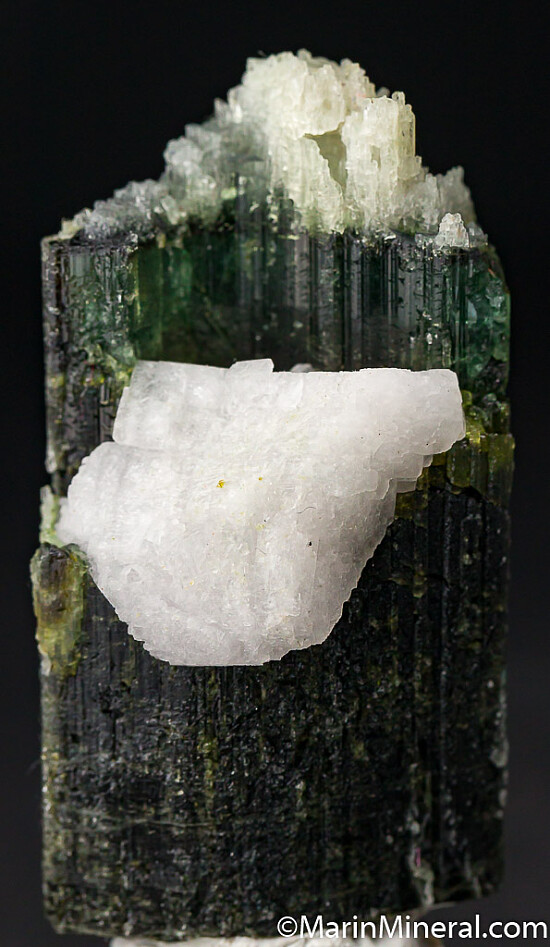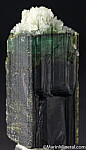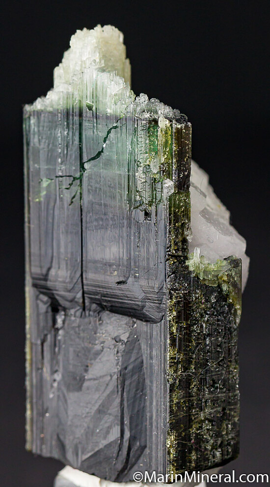 Blue/green Dravite crystal from an unusual, one time find in 2017. There is an opaque dark base followed by a translucent to transparent blue green zone, then a white cap. The white termination zone is partially etched but undamaged. There is a large white Albite crystal intergorwon in the backside. Rare coloration for Dravite.