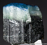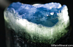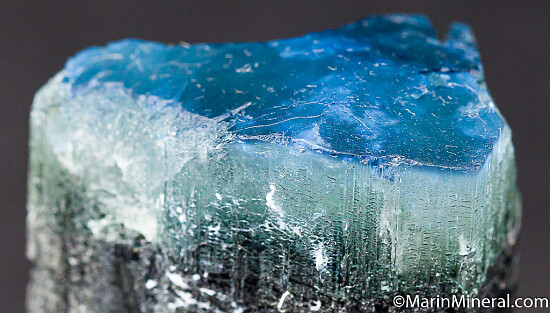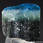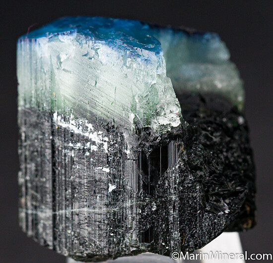 Blue capped Dravite crystal from a unique, 2017 find - these have not been found since. There is a deep blue cap, followed by a translucent white zone, over an opaque, dark base. The blue is intensly colored and unusual for Dravite. Like most/many of these, the blue and white tip only covers a portion of the darker base. On many the terminations is etched, but this crystal has nice flat, smooth termination faces.