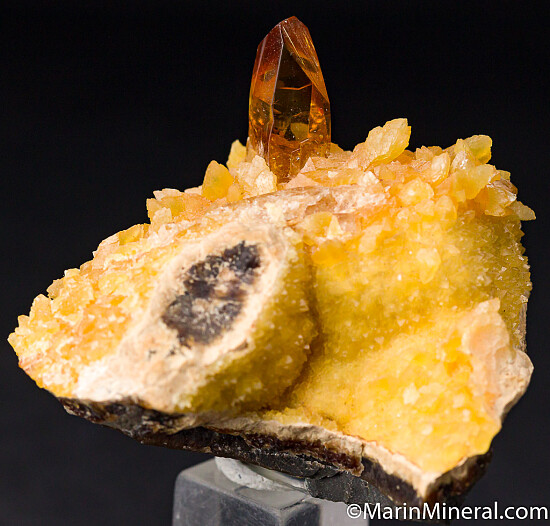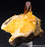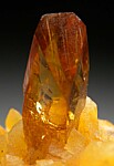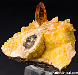 Gem quality 1.8cm Barite crystal on yellow Calcite crystals. Chipping along the back edge, otherwise undamaged with a perfect termination.