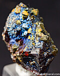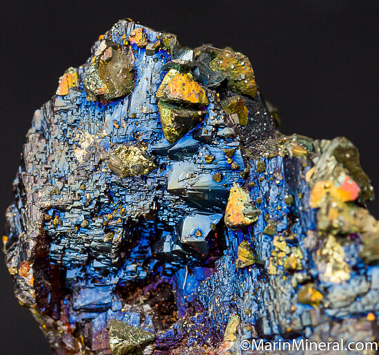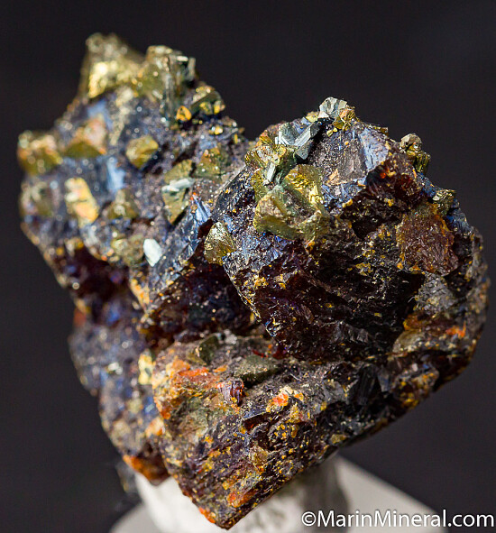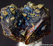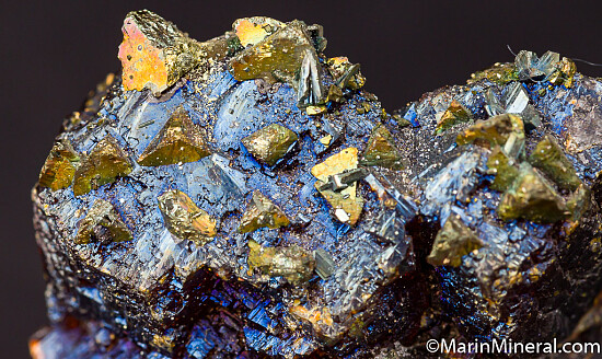 Translucent orange/red Sphalerite crystals with attached Chalcopyrite crystals. The Calcopyrite are all oriented in the same direction and the Sphalerite has an irridescent blue sheen on the surface. Old specimen.