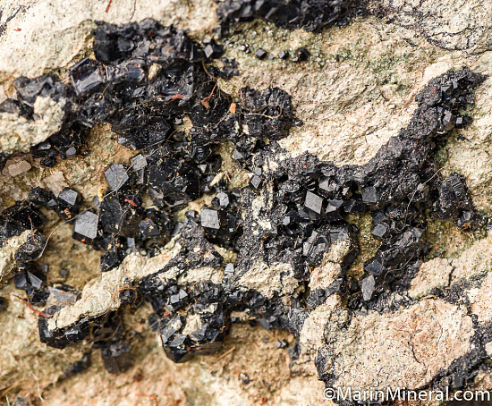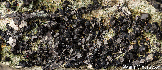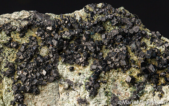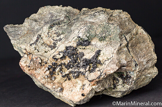 Large specimen with good coverage of Melanite crystals from an outcrop located near the Benitoite gem mine. Crystals on the front face reach 3mm and there are larger crystals to 6mm on the back side. This is a great large display piece for this locality. I've collected here a number of times and never found one this good. Valued at $300.