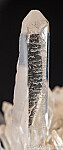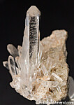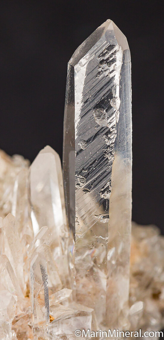 Cluster of transparent Quartz crystals with a main crystal showing unusual diagonal striations on alternating prism faces. Main crystal is 4.5cm long, water clear, and pristine. The similar striations on alternating faces are likely a result of twinning. This is out of an old collection with no locality information provided.