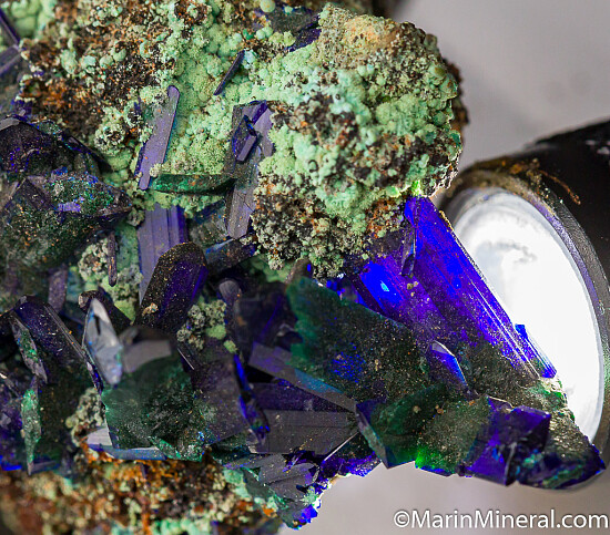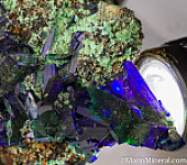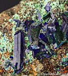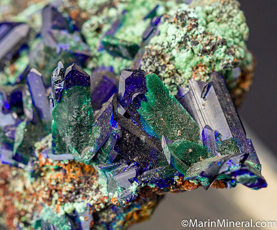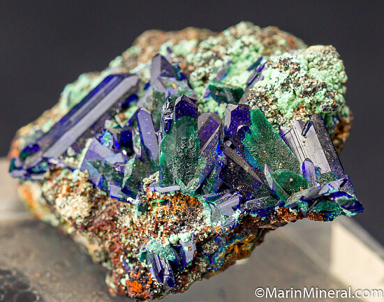 Gem Azurite crystals to 1.5cm on a Malachite covered gossan matrix. Found in the 1950s, these old Azurites are some of the most transparent ever found. Some are partially altered to Malachite on their lower halves. This specimen has larger than average sized crystals as most (when you can find them) have sub-1cm sized crystals. There are some broken crystals but most are good. Great old piece and rare to find now.