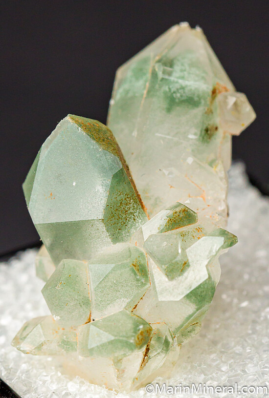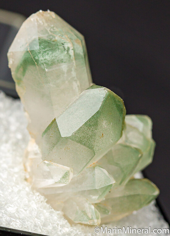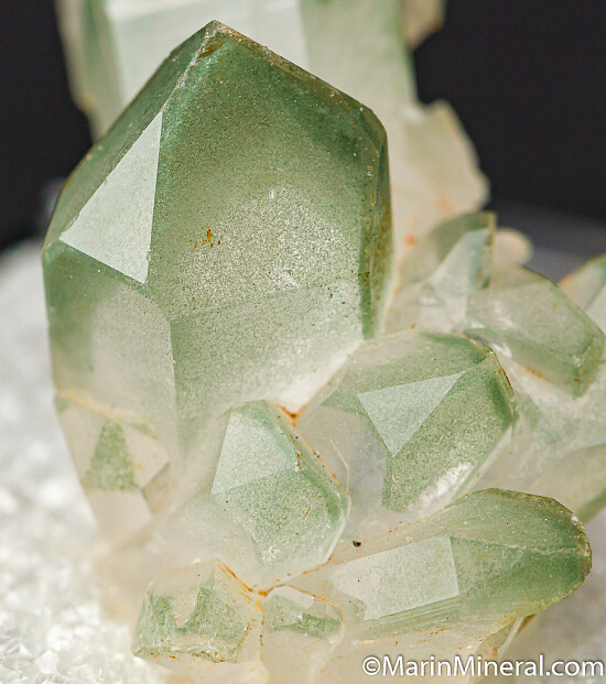 Thumbnail sized cluster of Quartz crystals from the foothills of the Sierra Mountains in California Gold country. The crystals inclusions of green Chlorite.