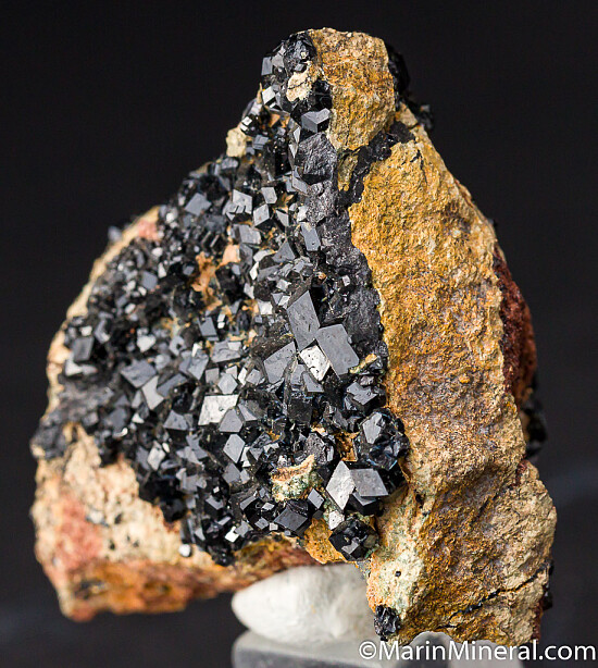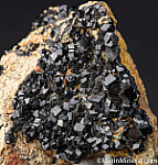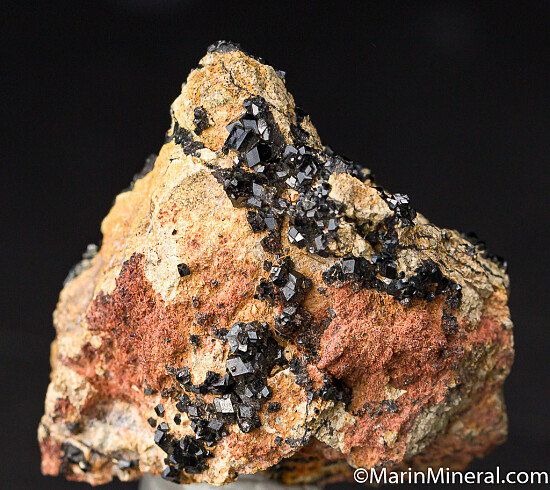 Black Andradite crystals to 5mm. Good, densely clustered crystals on both sides of matrix. Out of an old collection built in the 1970s-80s.