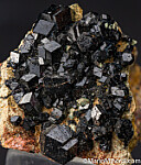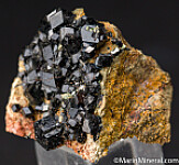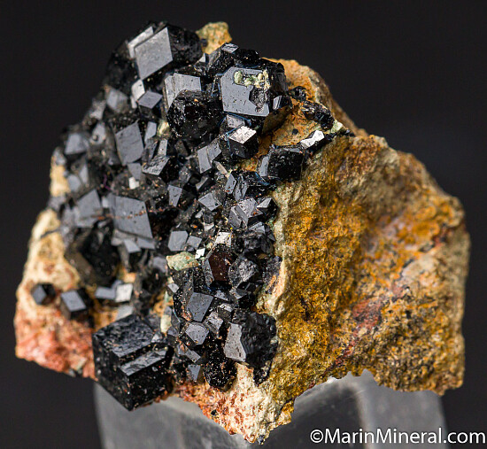 Black Andradite var. Melanite crystals on matrix from nearby the Benitoite Gem Mine. Bright, lustrous Melanite crystals to 6mm covering the display face. Nice piece for a garnet suite or San Benito collection.