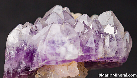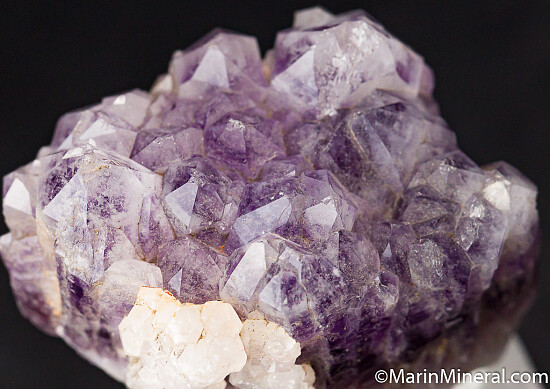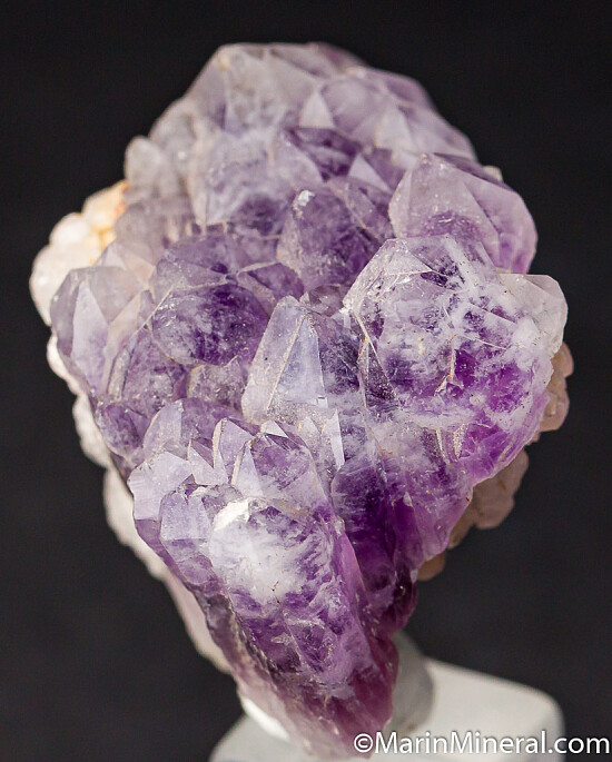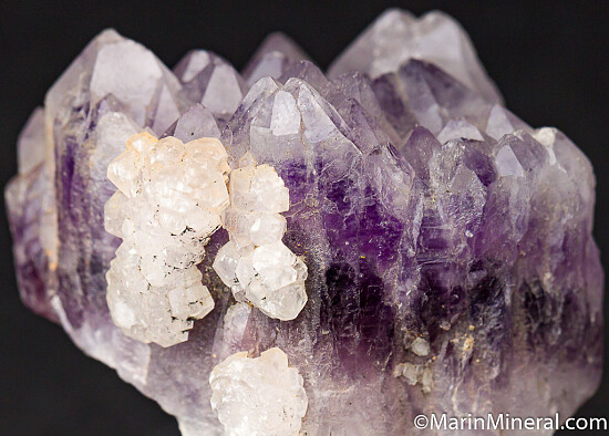 Floater specimwn of deep purple Amethyst crystals with attached clusters of white Calcite. The Amethyst druse detached from the pocket wall and was later crystallized on both top and bottom by clusters of white Calcite. Out of an old collection built in the 1970s-80s.