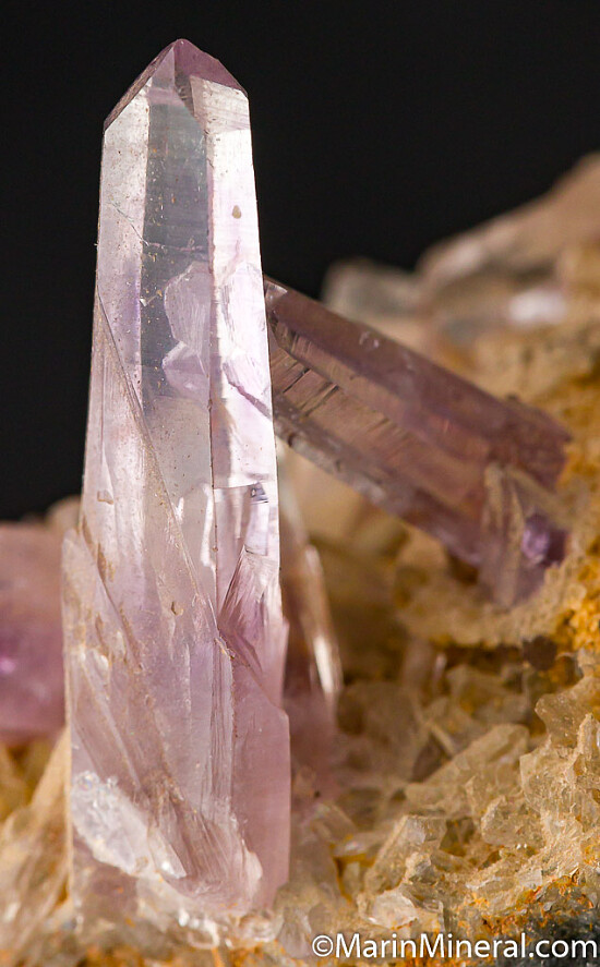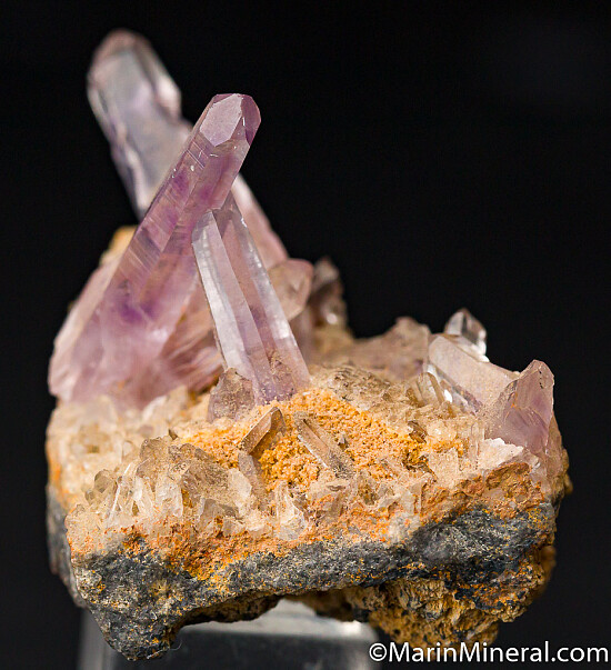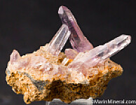 Water-clear crystals of Amethyst criss-crossing on matrix. Main crystals reach 2.5cm tall, undamaged. Out of an old collection built in the 1970s-80s.