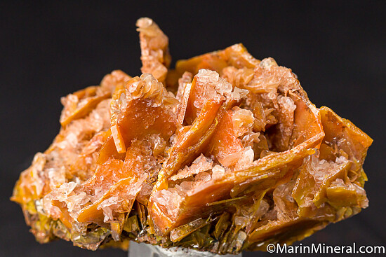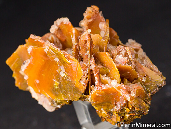 Classic old Los Lamentos specimen of large orange Wulfenite crystals and attached Calcite crystals. The Wulfenite reach 3.5cm in size. Old specimen Valued at $150.