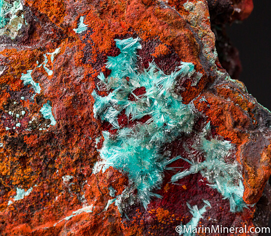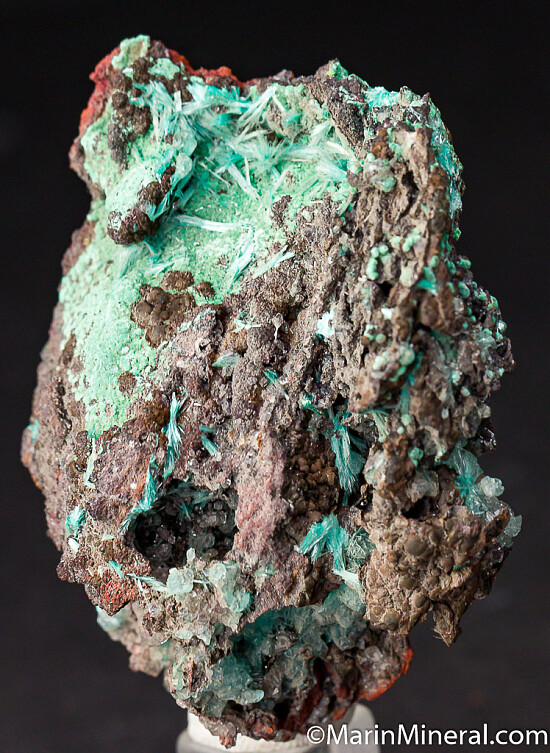 Sprays of acicular blue Aurichalcite, bubbly green Conichalcite, and transparent Hemimorphite line vugs in a Limonite matrix. Crystals everywhere!! This is one of those fun Mapimi pieces with lots of vugs and cavities lined with crystals. Old specimen from a 1980s era collection.