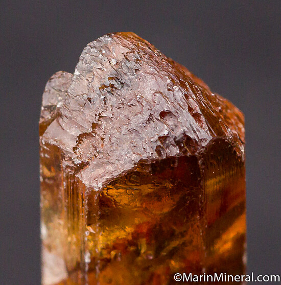 Gem quality, terminated Enstatite crystal from the Morogoro region of Tanzania. Transparent light brown with typical light etching, mostly on the back prism face and a gap on the back from another now gone crystals. Enstatite is rare as a gem quality crystal.