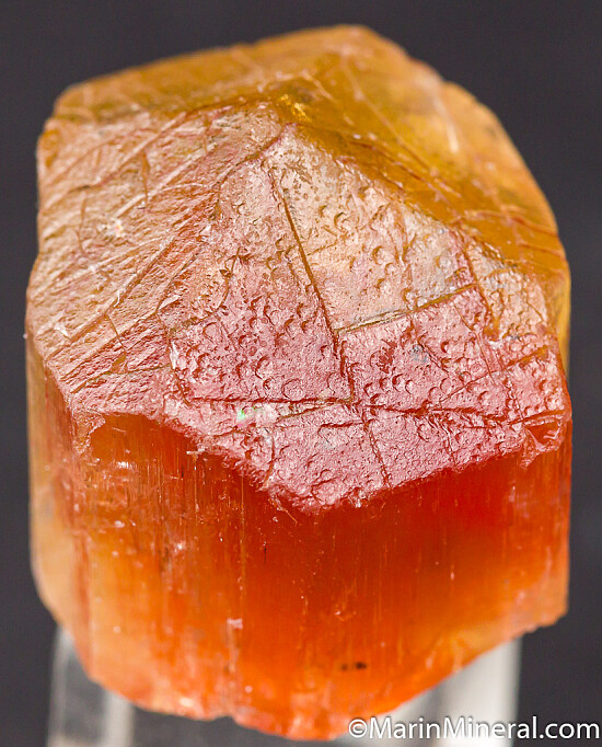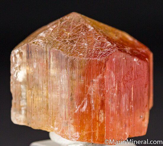 Bi-color Scapolite crystal that is part red and cat's-eye and part transparent and golden. Complete all around and undamaged except for a chip out of one lower side face. The cat's-eye shimmer can be seen when held sideways under a light. These red crystals are uncommon.