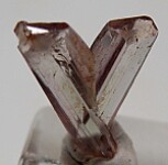 V-twin crystal of color change Diaspore. From new finds in the mountains near Milas, these new Diaspore crystals are spectacular in color and form. Glassy, flat termination faces, undamaged, and transparent inside. Light purple color in natural sunlight.Rare crystal valued at $250.