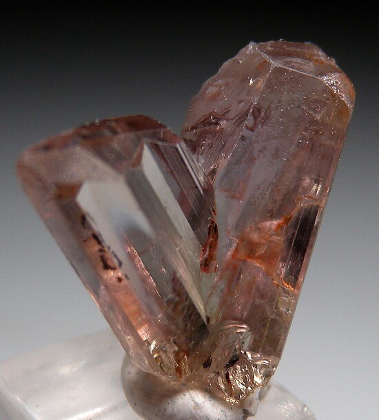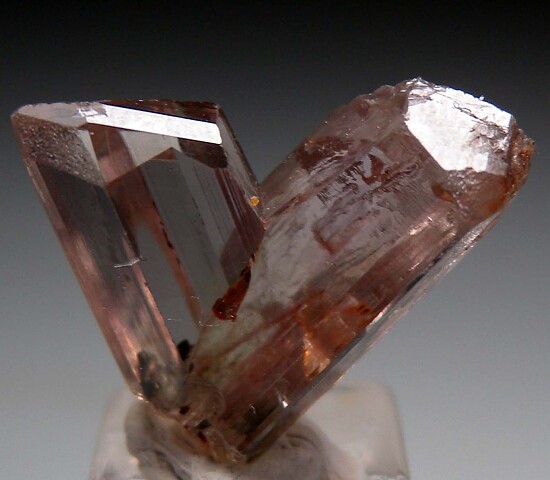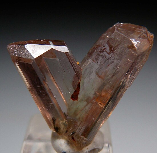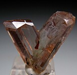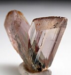 Newly found purple color change Diaspore crystal. These new crystals are really fantastic - terminated V-twin crystals with a more purple/lavender color in natural sunlight and a more greenish yellow color in incandescent light. One 'are' is perfect and the other 'arm' has a more irregular termination and a little cleave on the side. This is a good sized crystal for the find weighing 2.06 grams. Valued at $500.