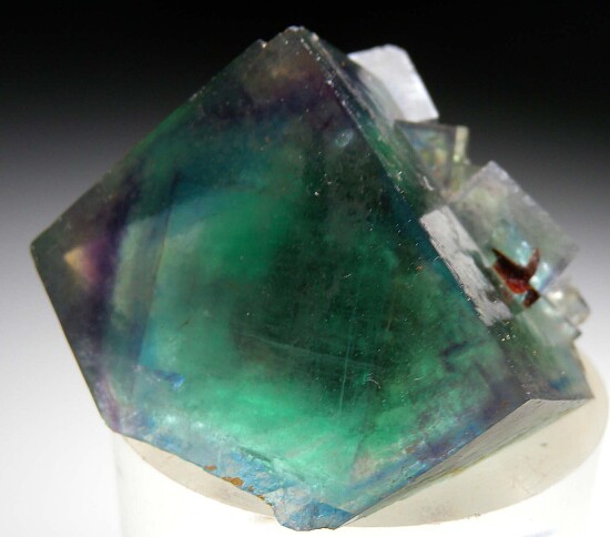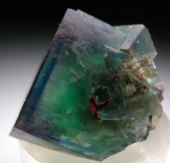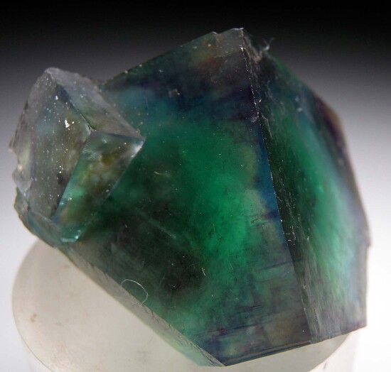 Cluster of transparent green cubic Fluorite crystals from Okorusu. Outstanding rich green color but the best part is the thin blue phantom near the edges. A real beauty.