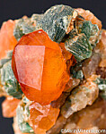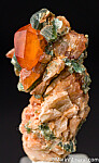 Orange garnet crystals and green Clinochlore on matrix. Largest garnet is 1cm, glassy and transparent. The only 'keeper' out of about 30 pieces I looked through.
