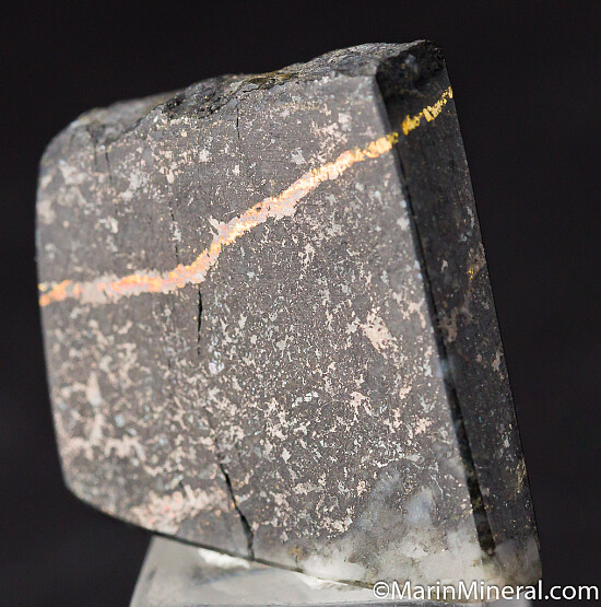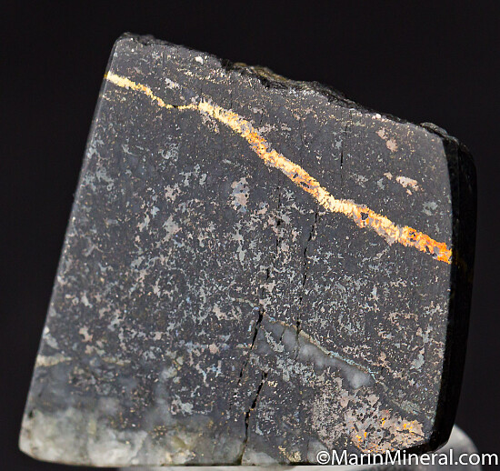 Small slab of ore consisting of Hessite, Tennantite, and Tetrahedrite with a vein of solid Gold running through and visible on both sides. Polished on front and back.
