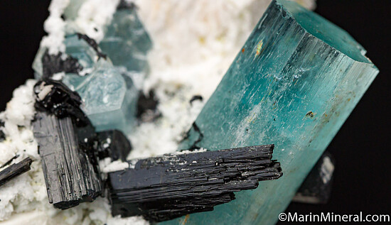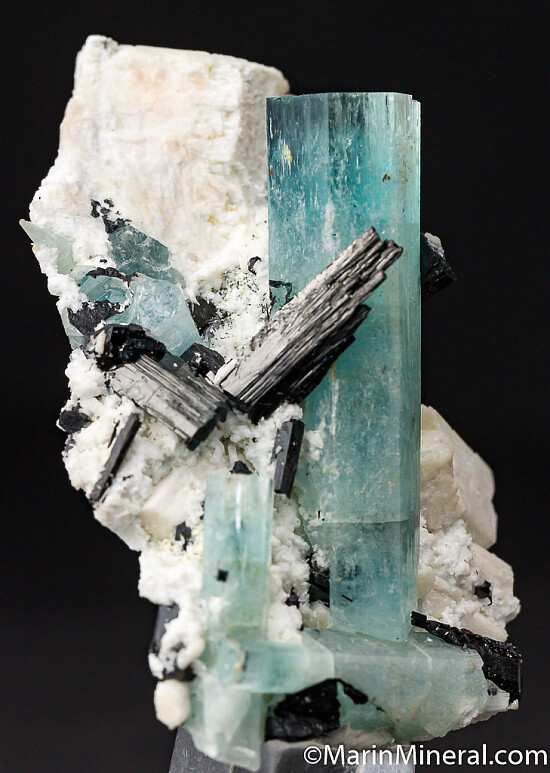 Medium blue Aquamarine crystals, black Schorl on stark white Feldspar. Main Aqua crystal is 5cm and undamaged.