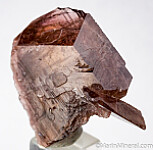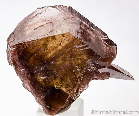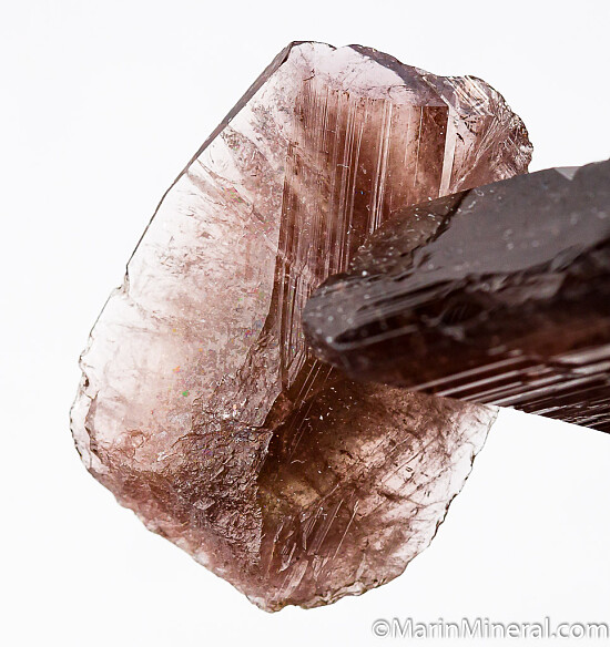 Large, gemmy single Axinite crystal with medium purple color and a smaller attached 2.2cm Axinite. Sharp and glassy on both sides. Slight edge chipping otherwise undamaged.