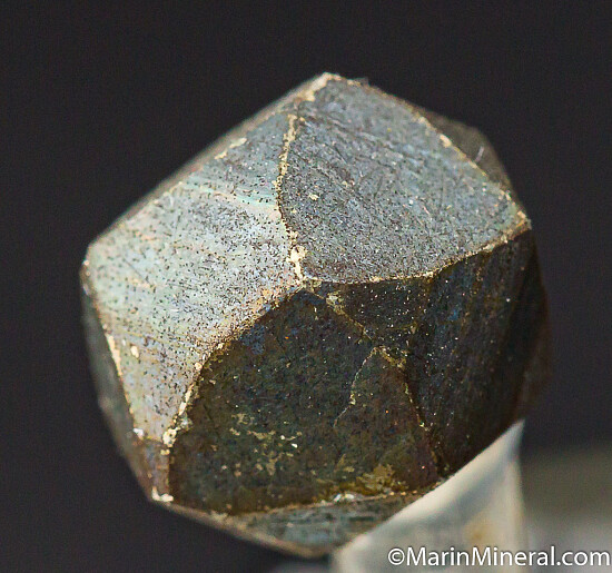 Complete, isometric Pyrite crystal with Pyritohedral form and a dark patina. Mounted on a stand in a perky box. Undamaged.
