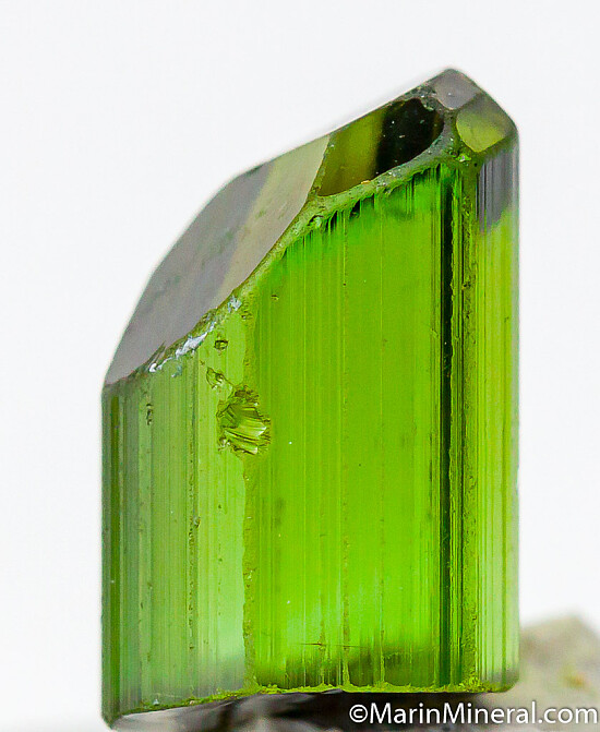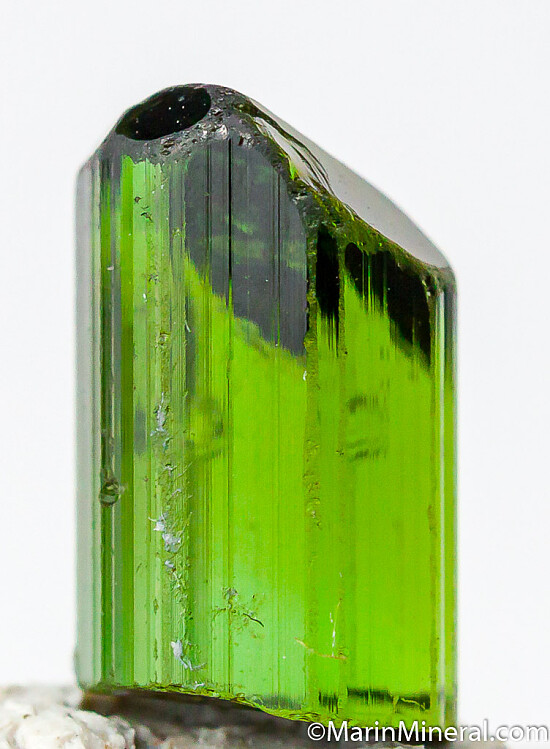 Single crystal of transparent green Tourmaline from new finds in the Congo. Congo Tourmaline is noted for it's varying colors and high transparency, an exciting new find for mineral collectors. This crystal is small but perfect with a complex termination and is as transparent as glass with no internal imperfections. Weighs 1.98 carats.