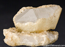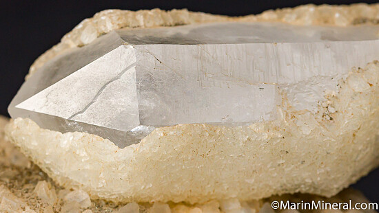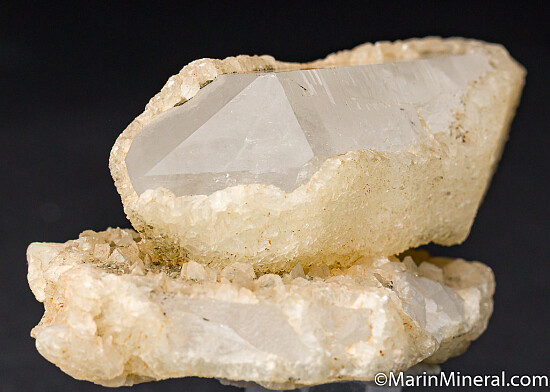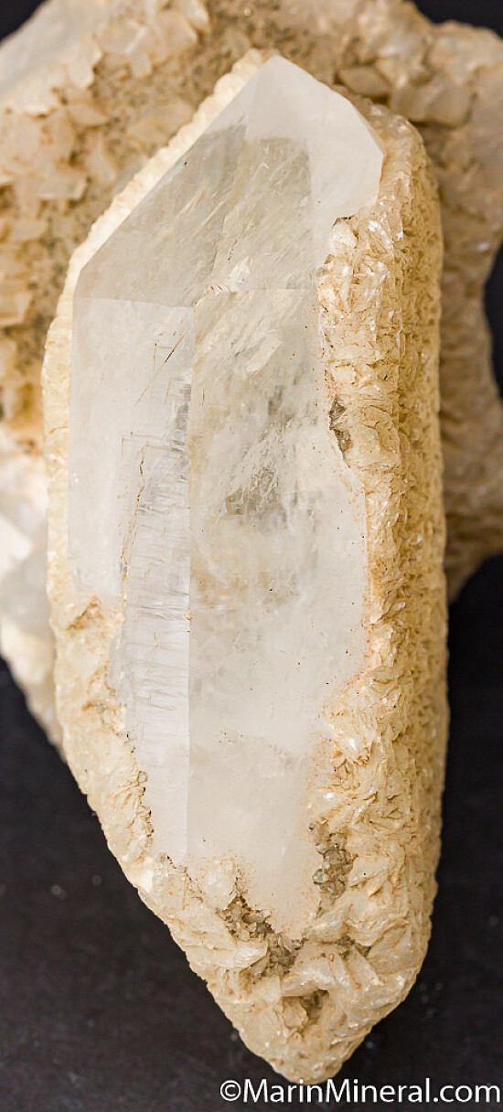 Wild specimen consisting of a large double-terminated Quartz crystal attached to a shard of Quartz by a thin layer of Calcite crystals. This is a floater specimen covered on all sides by Calcite. The two pieces (Quartz crystal and Quartz shard) must have deteched in the pocket naturally and were fused together by the Calcite crystals into one specimen.